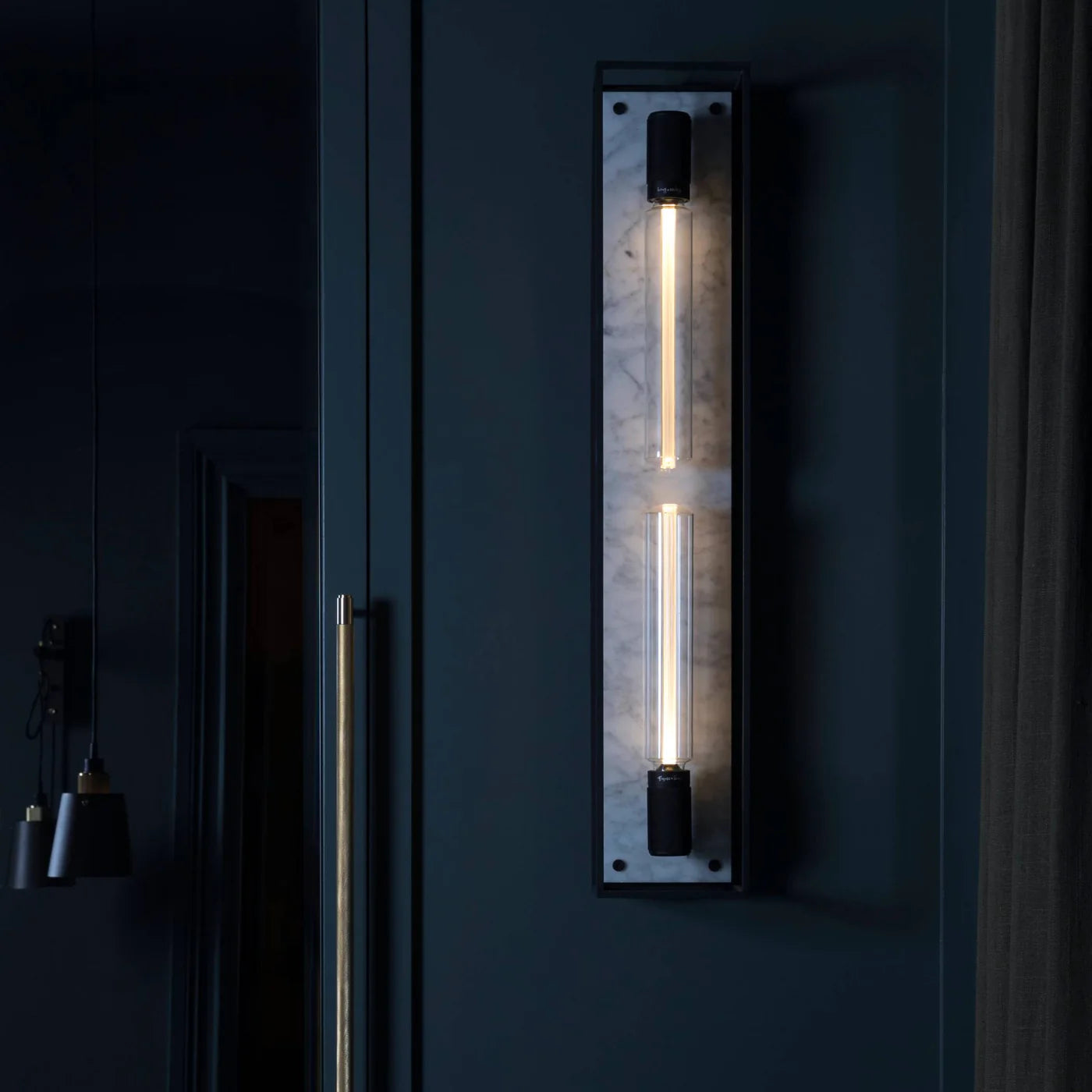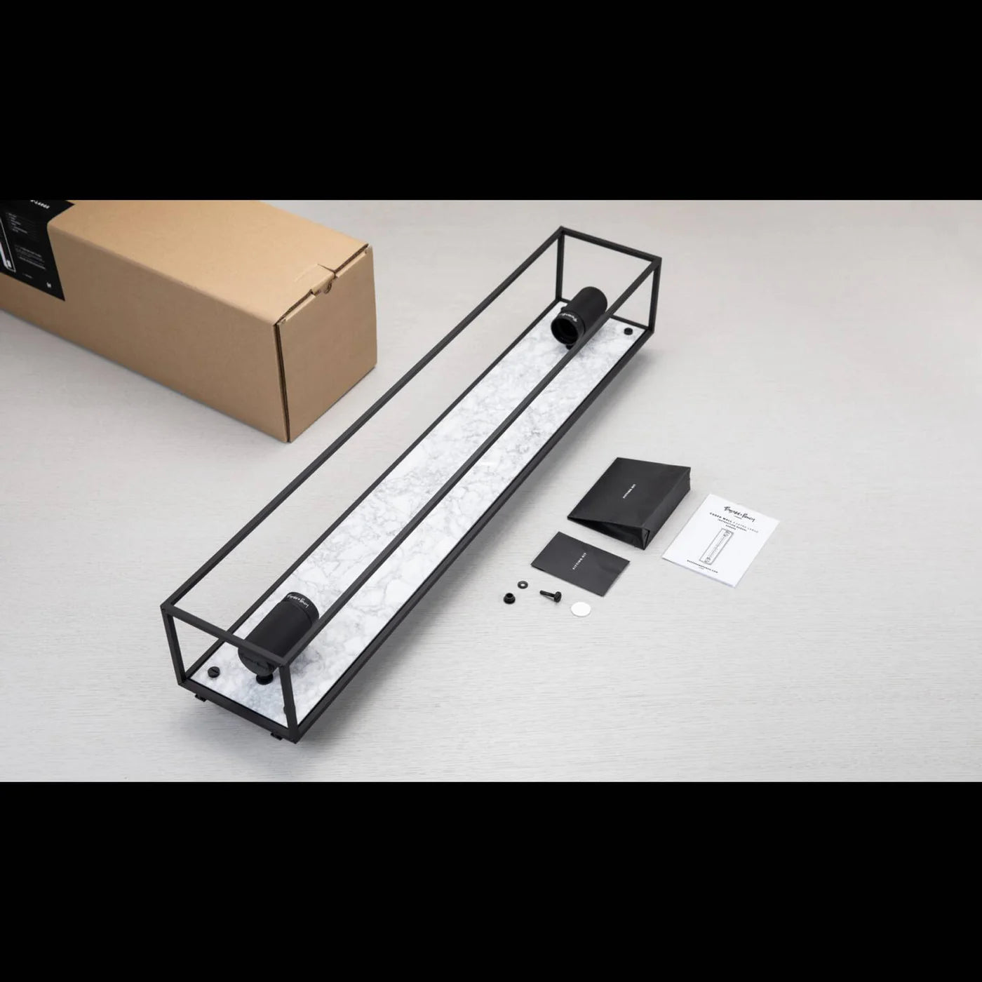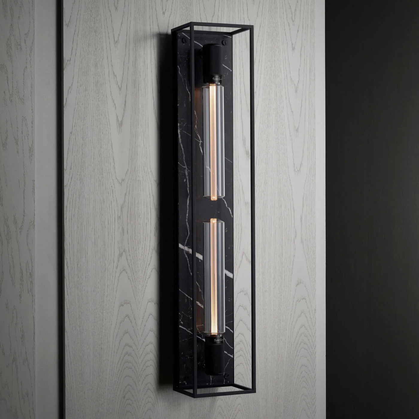 Caged Wall / Extra Large is a bold statement light designed for your wall or ceiling, featuring two LED Buster Bulb / Tubes. Crafted from a sturdy metal cage with an interchangeable back panel, it can be displayed individually, arranged in a linear sequence, or paired with other CAGED lights to create striking, large-scale installations and chandeliers. Bulbs are sold separately.