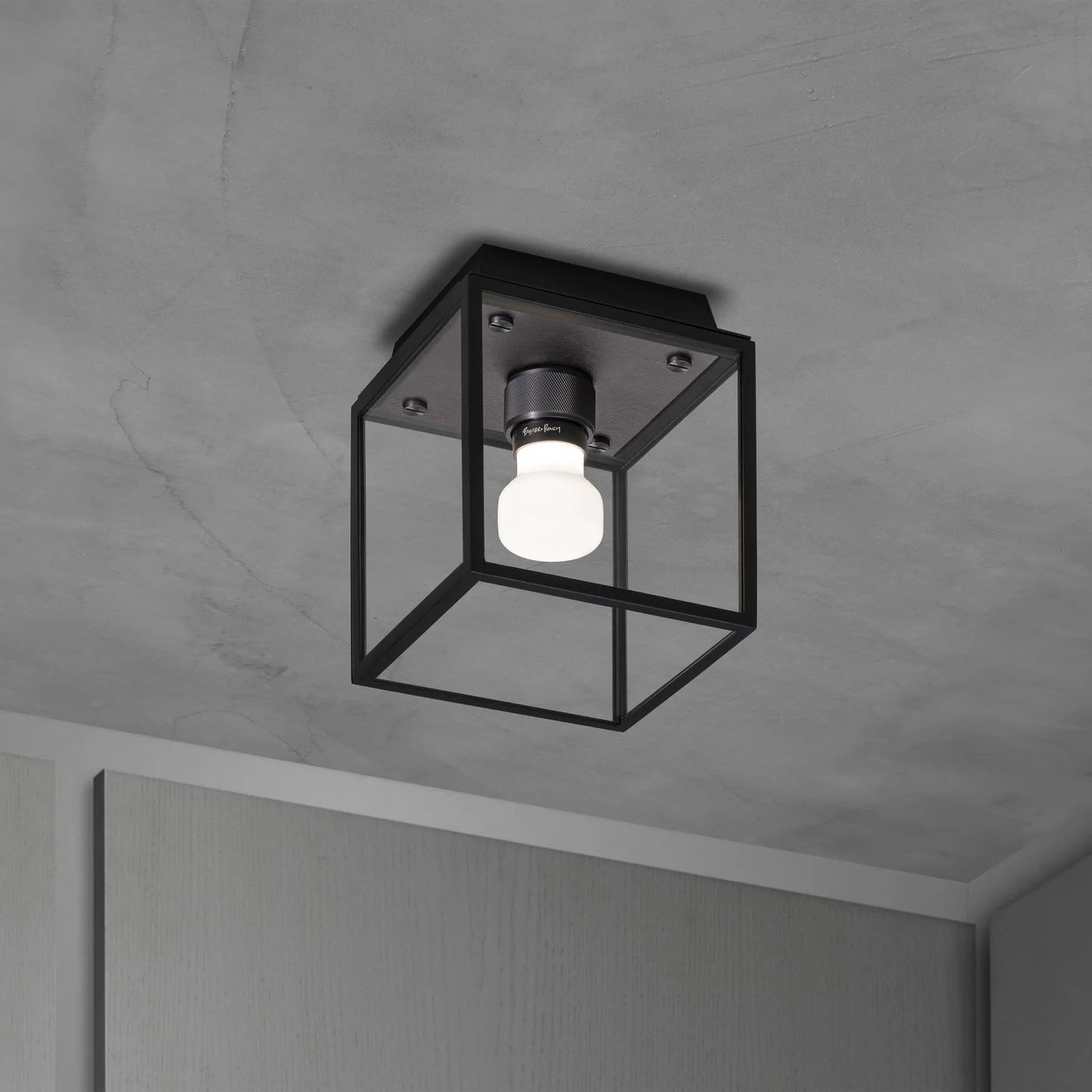 A luminaire crafted from matte black metal and a glass cage, featuring a cast metal back panel for a refined finish. It includes a solid metal, cross-knurled lamp holder accented with our signature coin screws. IP44 rated, this light is suitable for interior, exterior, and bathroom use. Available in steel, brass, and gun metal finishes. Please note: bulb not included.