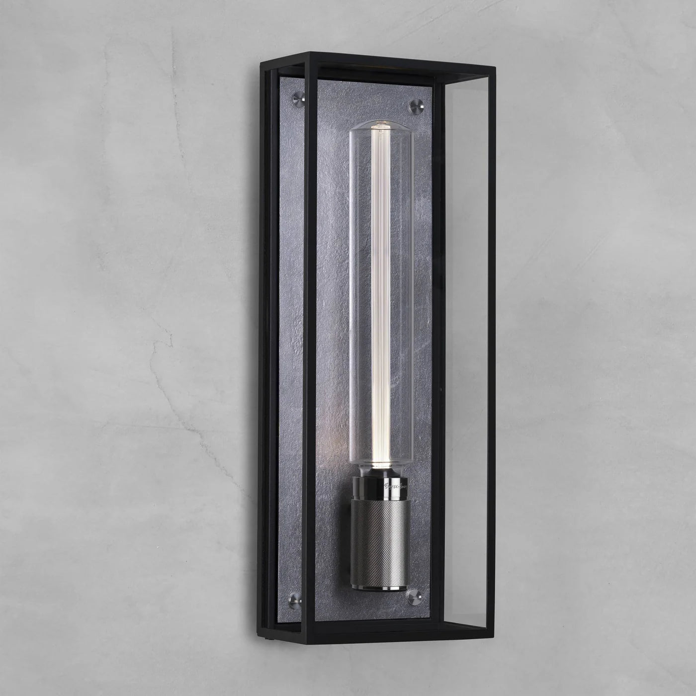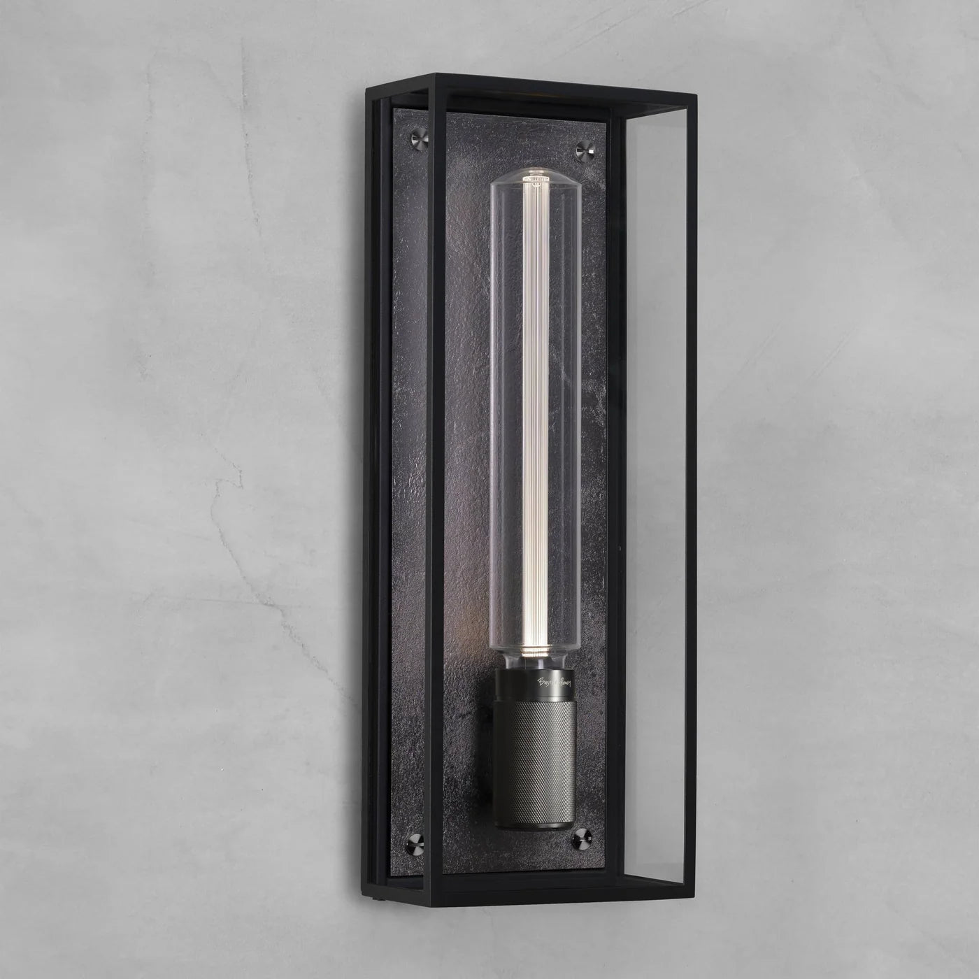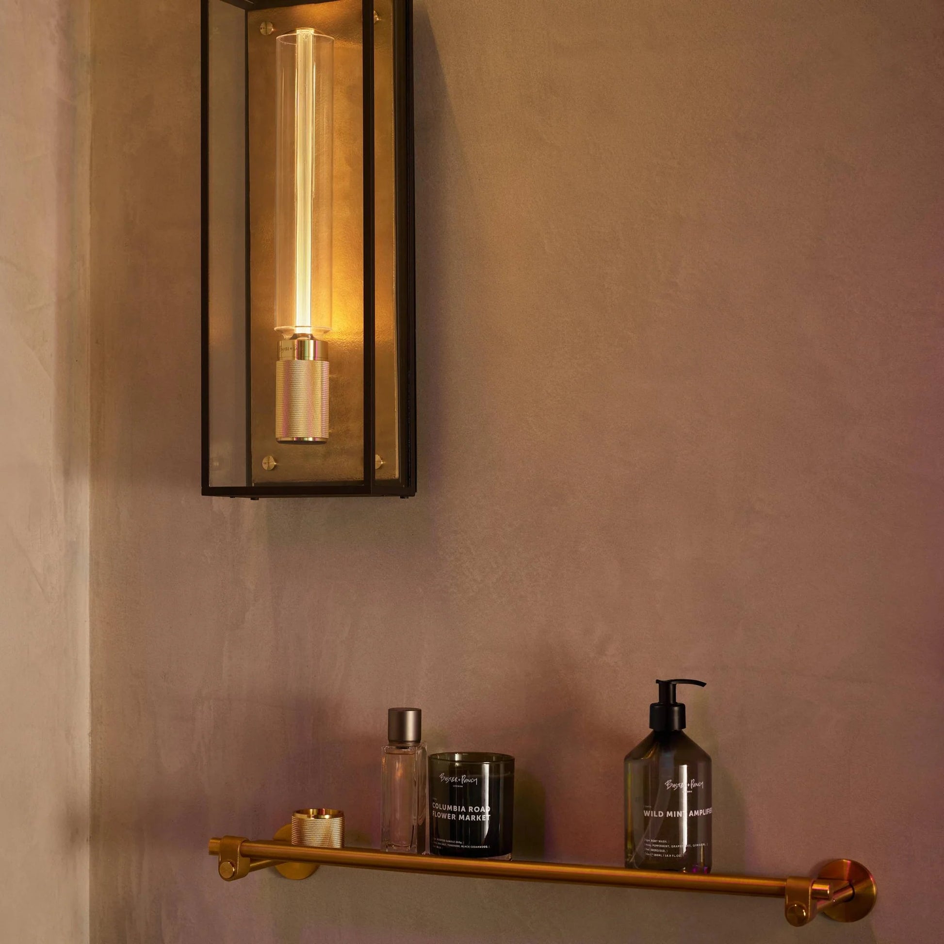A luminaire crafted from matte black metal with a glass cage and a cast metal backplate. It includes a solid metal lamp holder with a cross-knurled design and our signature coin screws. IP44 rated, it’s suitable for indoor, outdoor, and bathroom use. Available in steel, brass, and gunmetal finishes. Bulbs sold separately.